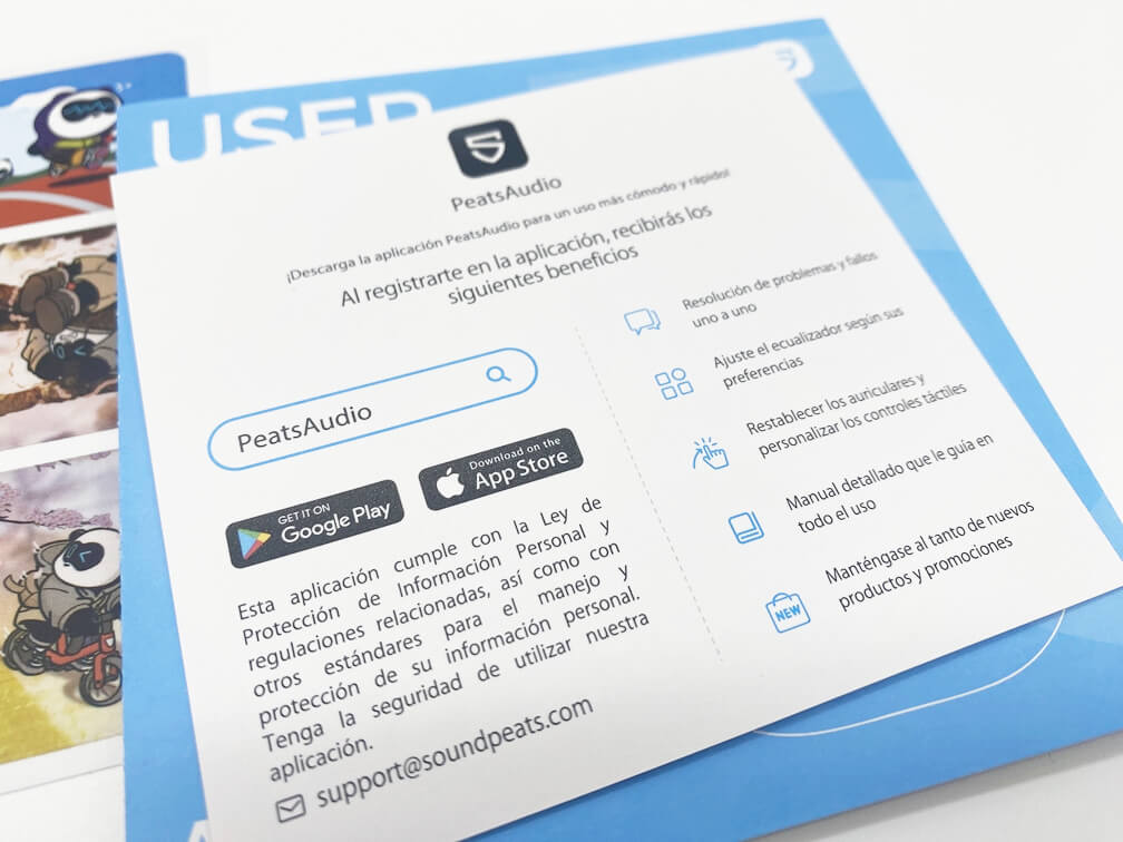 ▲付属品は「USBケーブル」「イヤーピース」「取説」「アプリカード」「ピーツくんステッカー」が同梱されております。