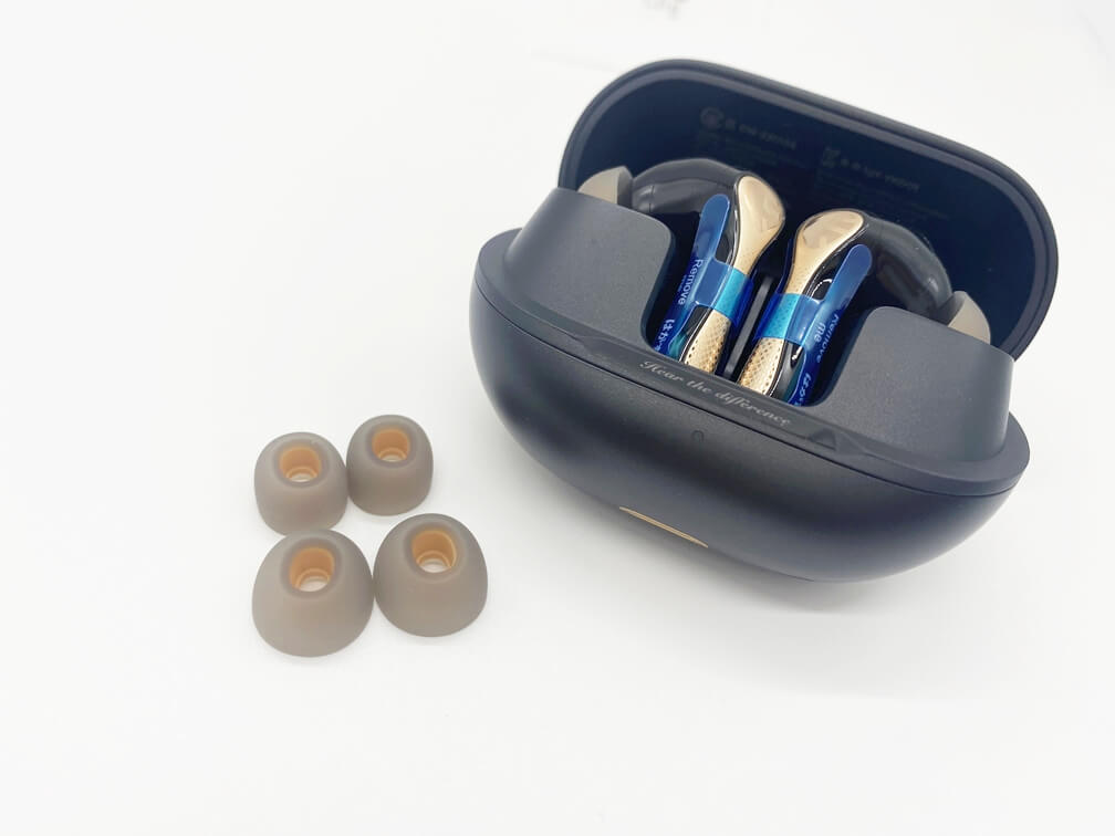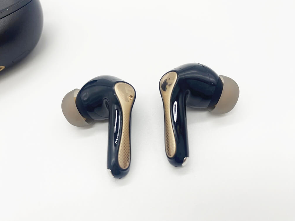 ▲今回のSOUNDPEATS Air5 Pro+はブラック×ゴールドで高級感のあるデザインとなっております。