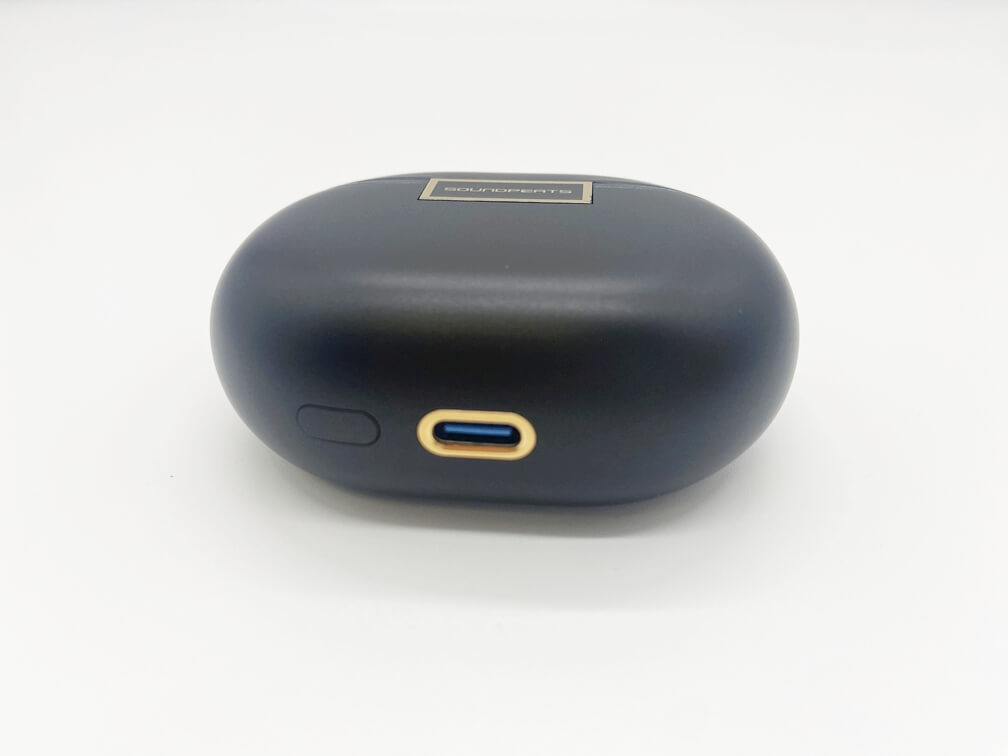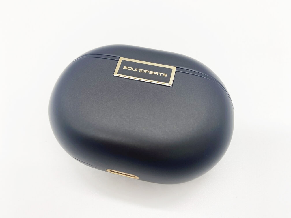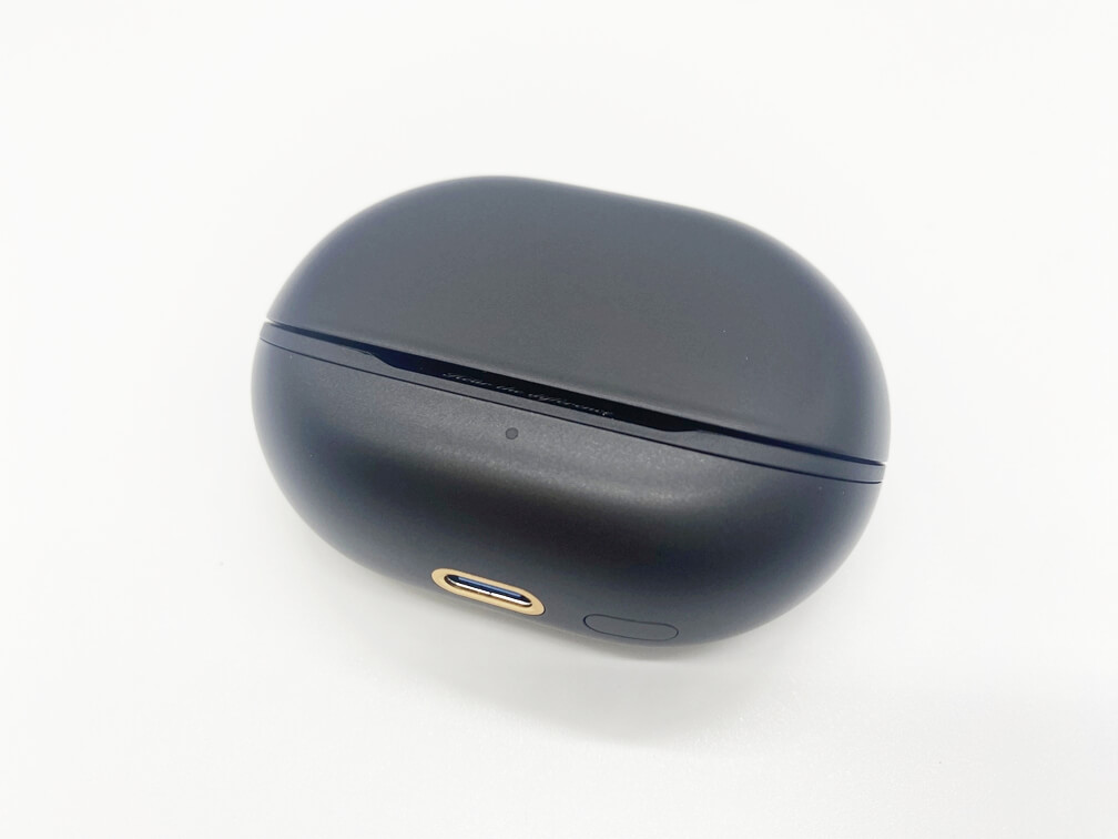 ▲充電ケースはシンプルでコンパクトにまとまっており、ロゴやUSBの縁など細かいところにゴールドが配色されています。